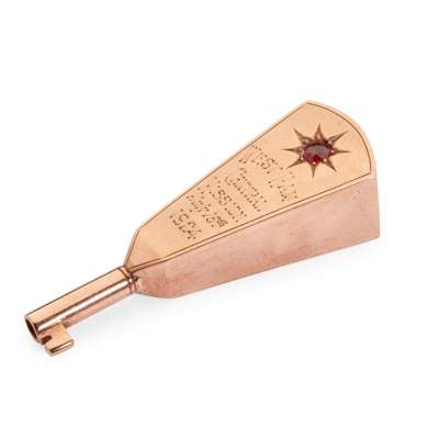 claw-set with a round-cut garnet, with presentation inscription 'West Ham Central Mission July 16th 1924 / Organ presented and opened by Dame Clara Butt DBE'