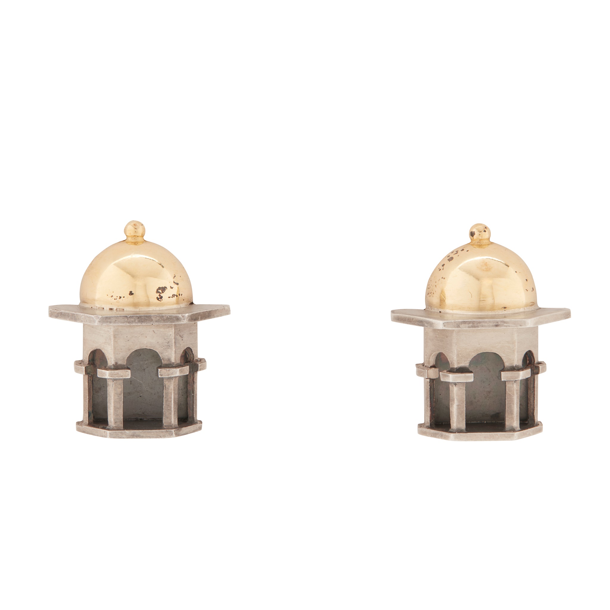 each modelled as an 18th century folly with gilt detail to dome, post and butterfly fittings, modelled in silver
