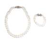 the necklace composed of two rows of cream and blue-ish silver cultured pearls, to an oval clasp pavé-set with rose-cut diamonds and an oval-cut sapphire, unmarked; together with a matching bracelet, the scrolling clasp set throughout with rose-cut diamonds, stamped 9ct