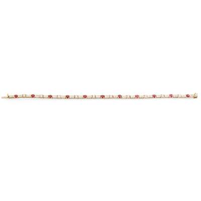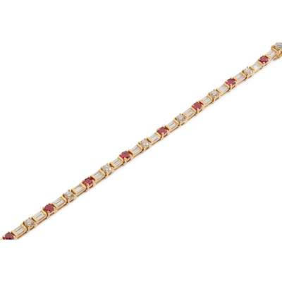 composed of a single row of alternating round-cut rubies and diamonds between pairs of baguette-cut diamonds, modelled in 18ct gold