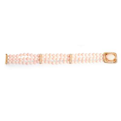 composed of three strands of coral beads set at intervals with diamond spacers, the clasp claw-set with an oval cabochon coral in a ribbed surround with small round-cut diamond detail, stamped 585 14K