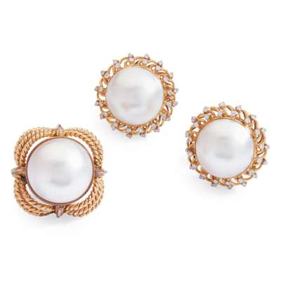 each set with a mabé pearl in a border of small round brilliant-cut diamonds, post and clip fittings, stamped 750; together with a mabé pearl brooch in a rope-twist border, unmarked