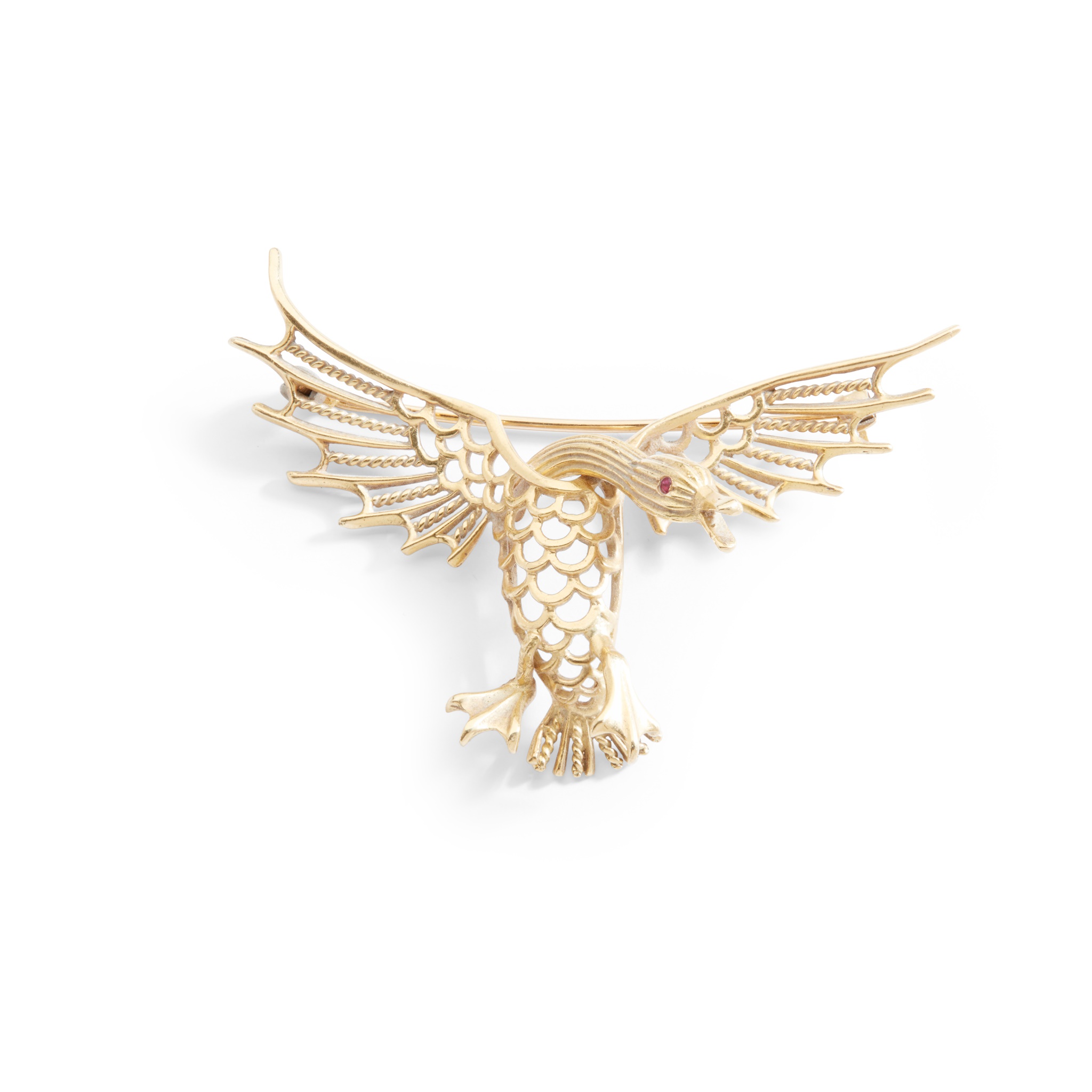 modelled as a goose with pierced detail and round-cut ruby eyes, modelled in 18ct gold