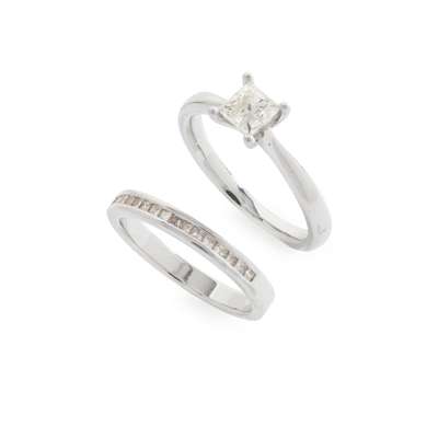 claw-set with a princess-cut diamond, modelled in platinum; together with a matching princess-cut diamond half eternity ring, stamped 950