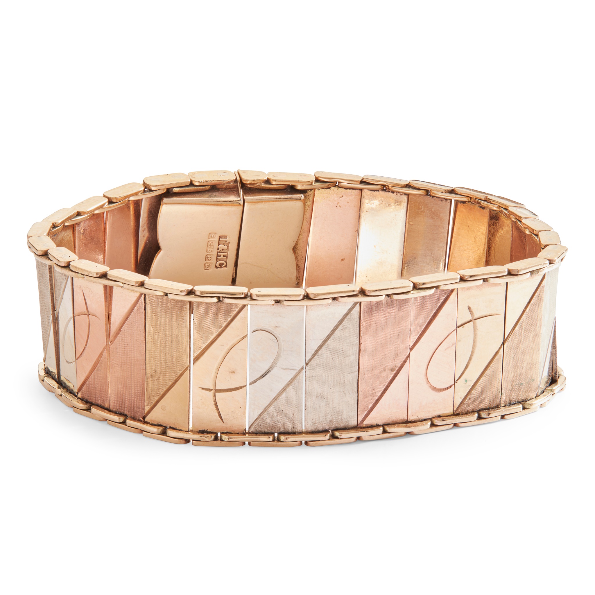 of panelled design, modelled as alternating polished and engraved yellow, white and rose gold links, to a concealed clasp and safety chain, modelled in 9ct gold