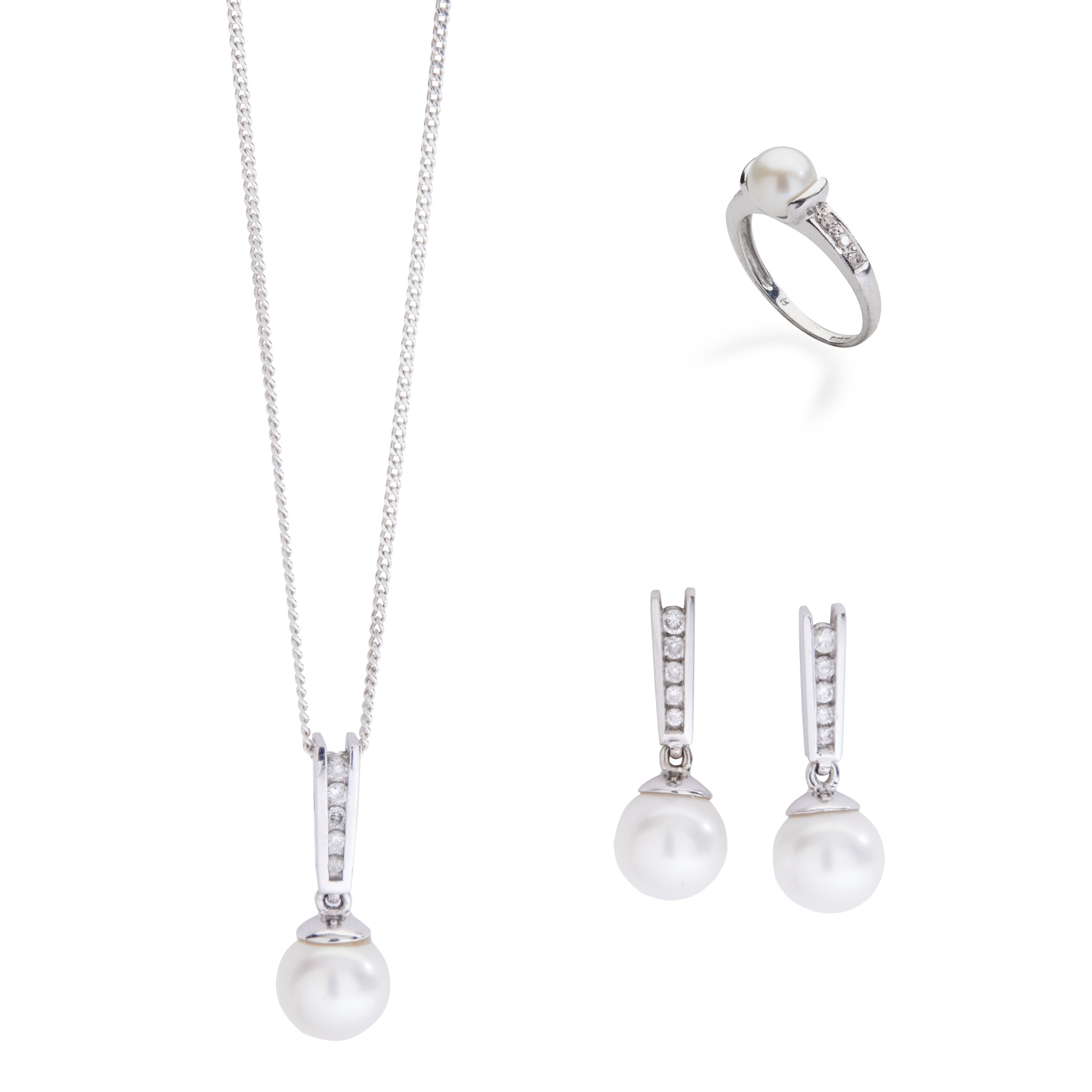 including a pendant, ring and earrings, each set with a cultured pearl and graduated round brilliant-cut diamonds, the pendant and ring modelled in 9ct gold, the earrings modelled in 18ct gold