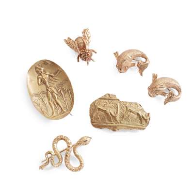 including a pair of brooches modelled as fish, unmarked; a small bee brooch, unmarked; another modelled as a snake, unmarked; and two brooches with cast detail of classical motifs, indistinct marks