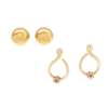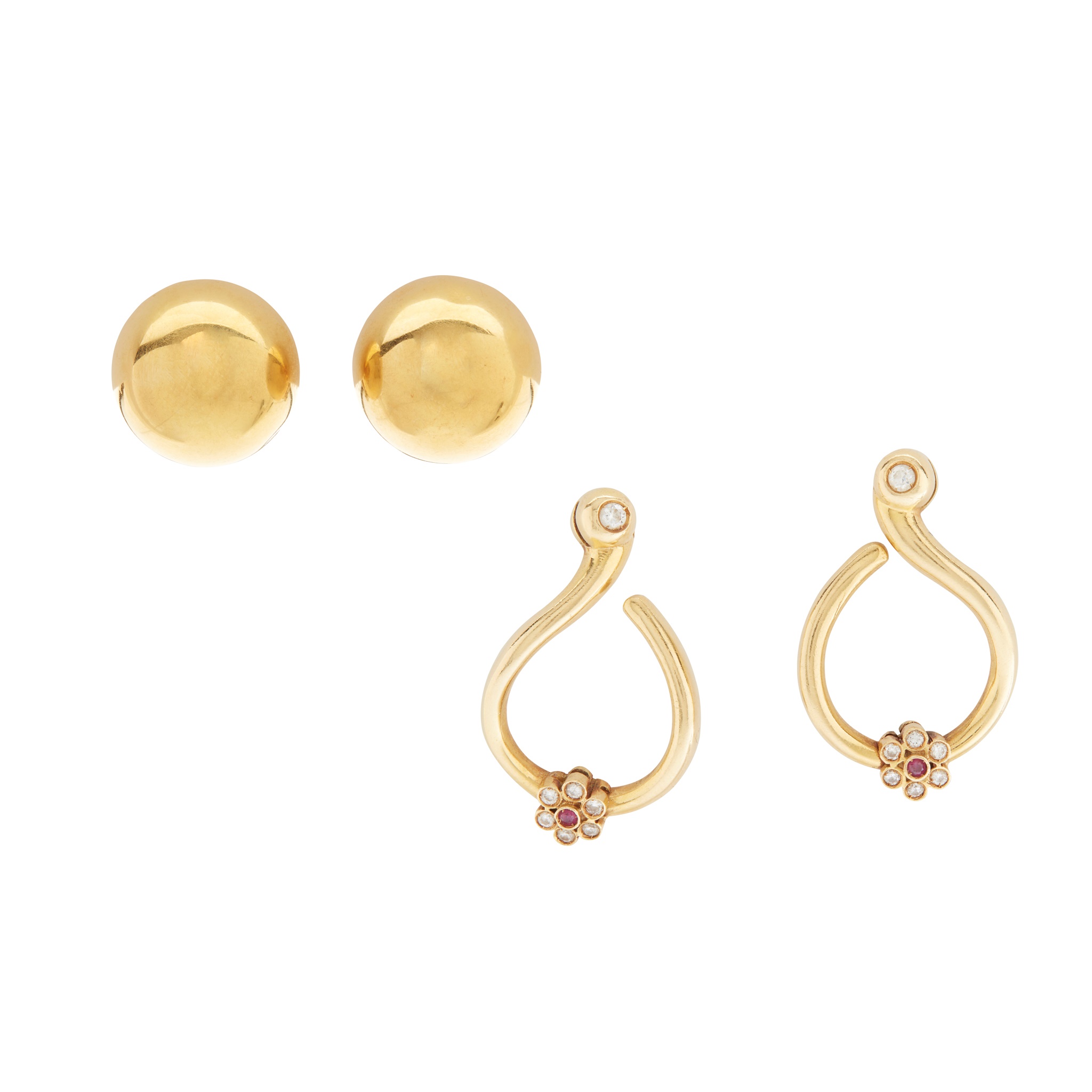 of open scrolling design set with small round-cut diamonds and rubies, post and butterfly fittings, unmarked; together with a pair of domed earrings, post and butterfly fittings, stamped 750