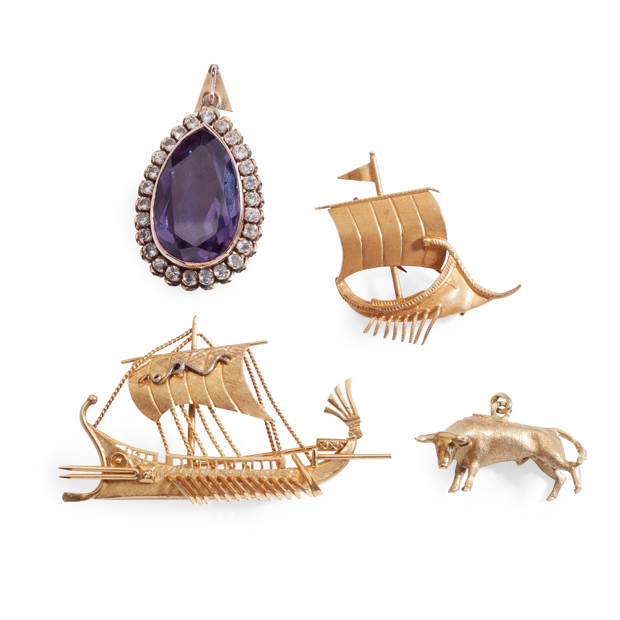 including two brooches modelled as Viking longships, one stamped 18k the other unmarked; a pendant modelled as a bull, indistinctly marked; a pear-shaped synthetic colour-change sapphire pendant in a border of round-cut colourless gems, stamped 14k