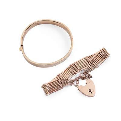 of hinged design, engraved scrolling foliate detail to front half, concealed clasp and safety chain; together with a gate-link bracelet, stamped 9ct