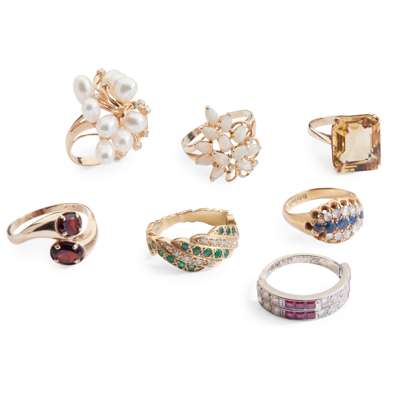 including a 14ct gold pearl and diamond dress ring, an 18ct gold sapphire and diamond ring; a 14ct gold opal and diamond dress ring, a ruby and diamond half-eternity ring, stamped 18ct; an emerald and diamond ring, stamped 18ct, a garnet ring, unmarked; and a citrine cocktail ring, unmarked