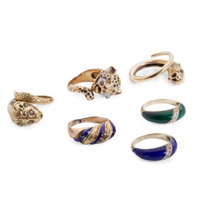including three gem-set and enamel leopards head rings, one with French marks, one stamped 750 and the other unmarked; and three enamel and gem-set dress rings, unmarked