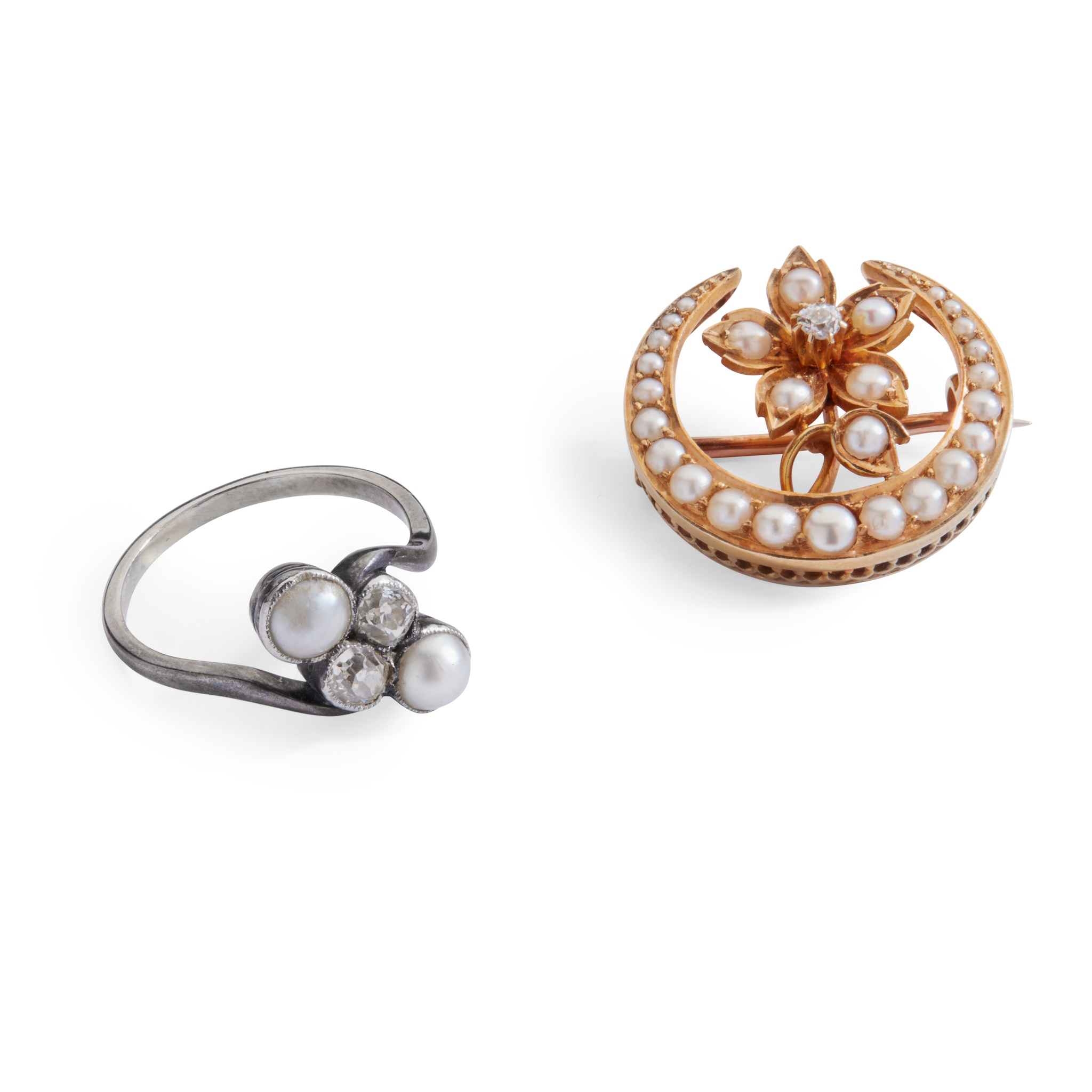of crescent and floral outline, set with seed pearls and an old round-cut diamond, unmarked; together with a pearl and diamond ring, millegrain-set with two half-pearls and two old cushion-cut diamonds, unmarked