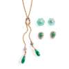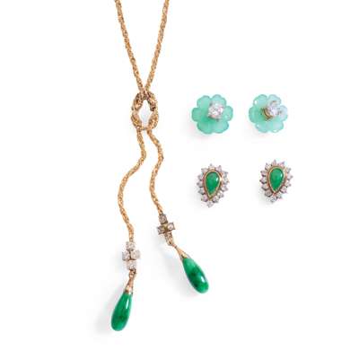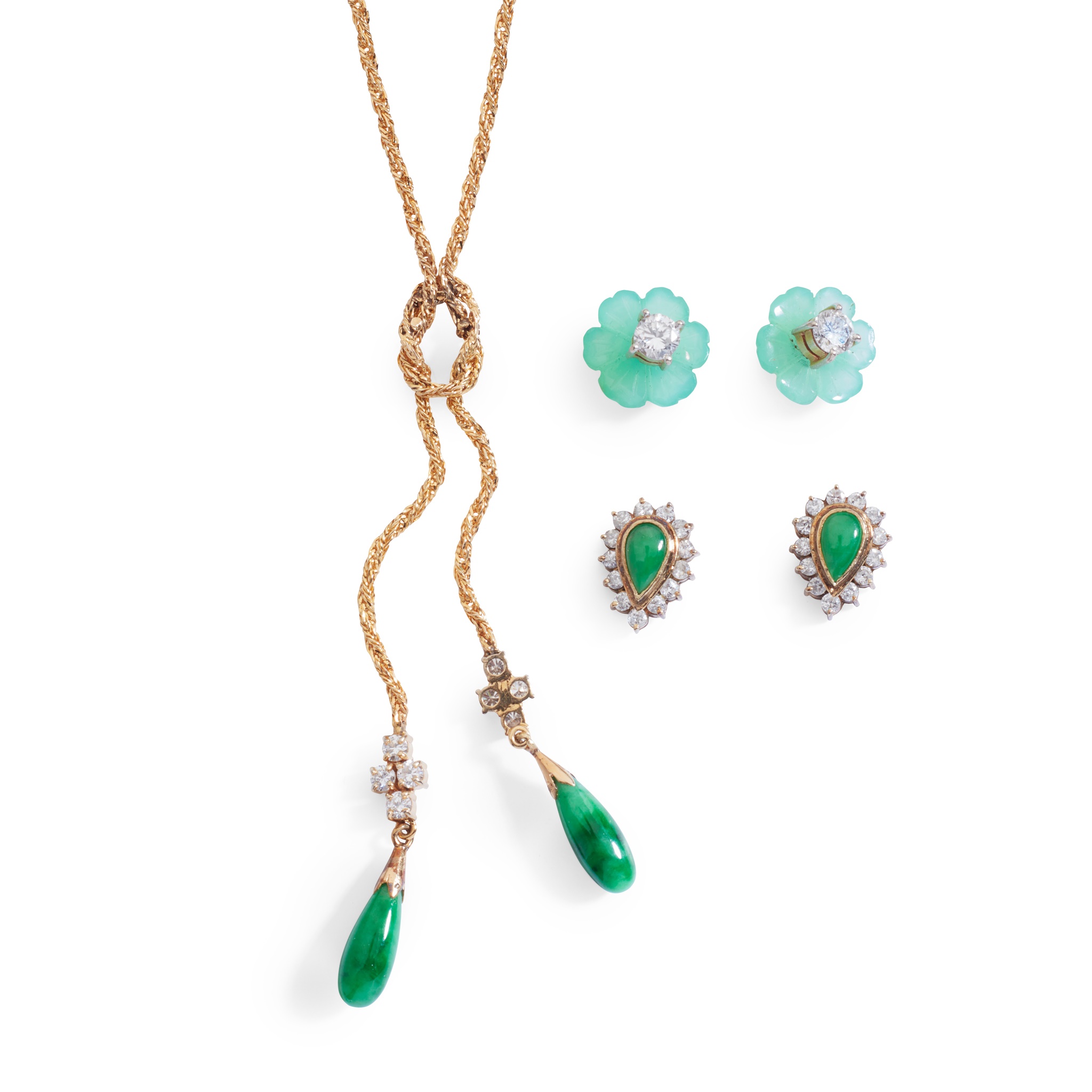composed of a rope-twist chain, suspending two pendants each set with a polished jadeite drop and four round brilliant-cut diamonds, stamped 585; together with a pair of diamond studs, with detachable green hardstone floral border, unmarked; and a pair of jadeite and diamond pear-shaped cluster earrings, unmarked