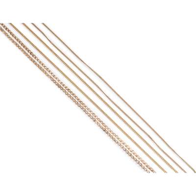 including a flattened curb-link chain, indistinctly marked; and another shorter example stamped 585; and a fancy-link chain, stamped 585