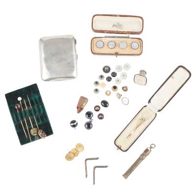 including two enamel and diamond studs and matching tiepin; five other stick pins, one set with a cabochon turquoise; various studs; a cased set of four enamel and pearl studs; a silver mounted desk seal with engraved armorials; cigarette case etc.