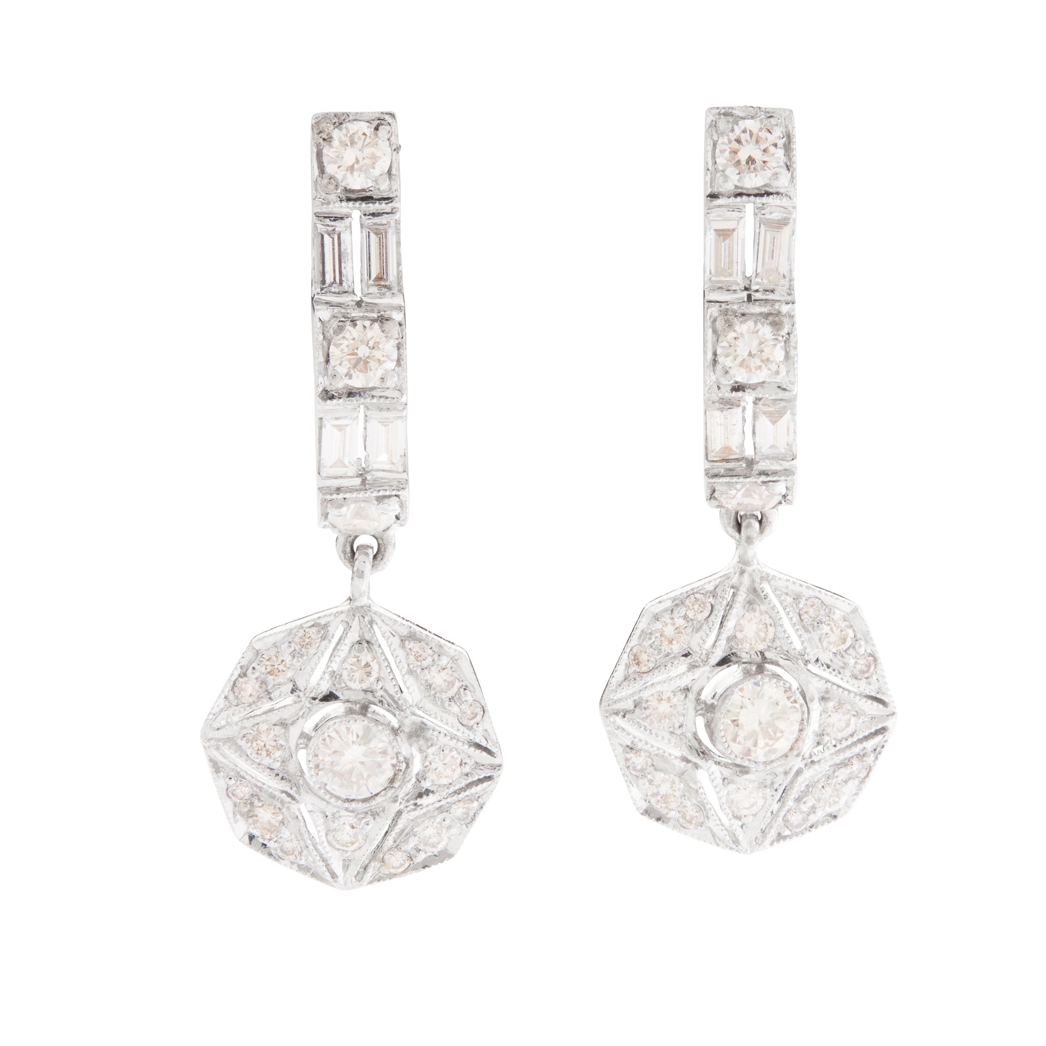 each composed of a row of alternating round brilliant and baguette-cut diamonds, suspending a circular drop set with round brilliant-cut diamonds, post and hinged clip fittings, stamped 750