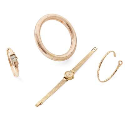 of plain design, fully hallmarked; together with a torc-style bangle, stamped 750; a 9ct gold bangle watch and an 18ct gold lady's wristwatch