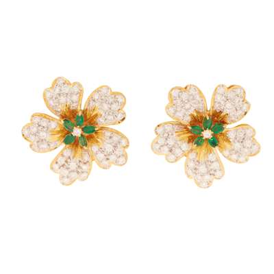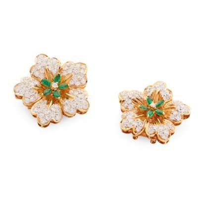 each of floral design, pavé-set with round brilliant-cut diamonds, marquise-cut emerald detail, post and clip fittings, unmarked; together with two matching necklace/bracelet clasps, stamped 750