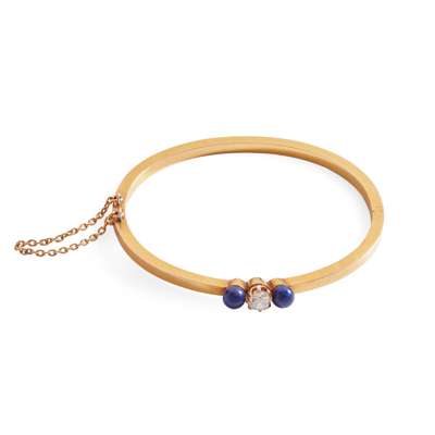of hinged design, claw-set with a cushion-cut diamond and two lapis lazuli beads, French control marks