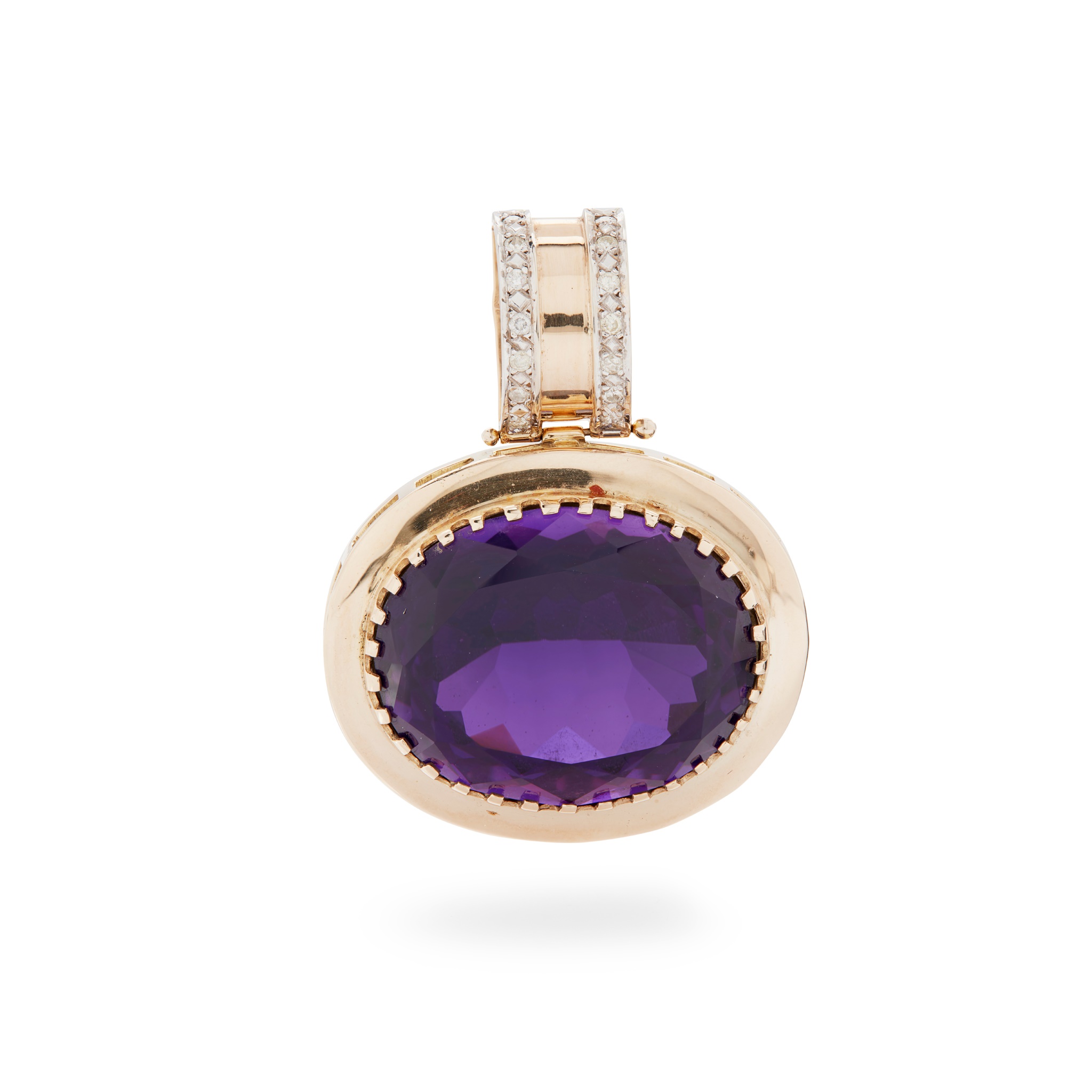 claw-set with an oval-cut amethyst, the bale set with two rows of round brilliant-cut diamonds, stamped 14k