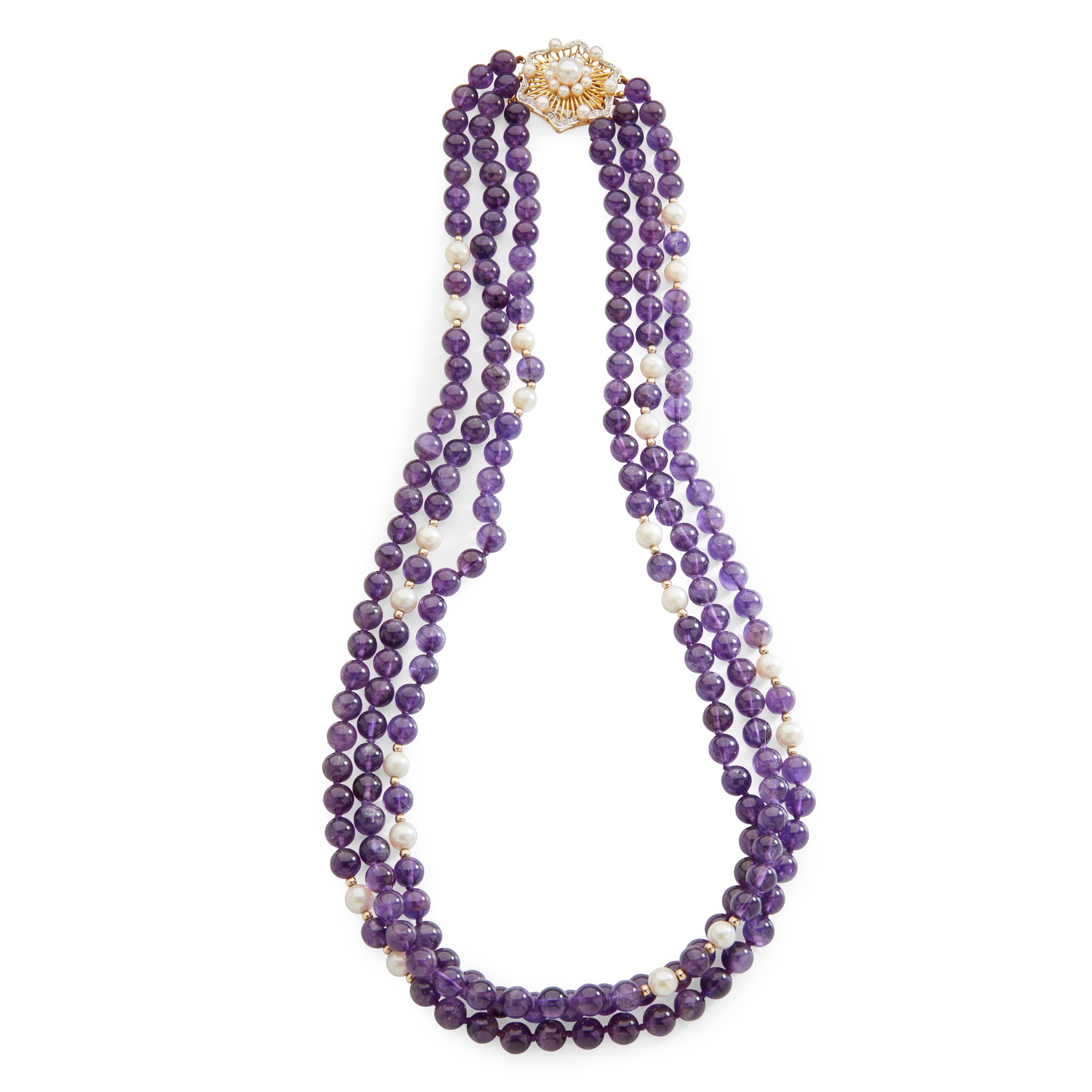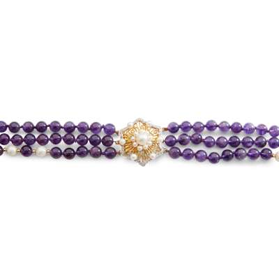composed of three strands of amethyst beads set at intervals with cultured pearls, the clasp of pierced design, set with cultured pearls and small eight-cut diamonds, stamped 14k 585