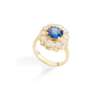 claw-set with a round-cut synthetic sapphire in a border of graduated round brilliant-cut diamonds, stamped 750