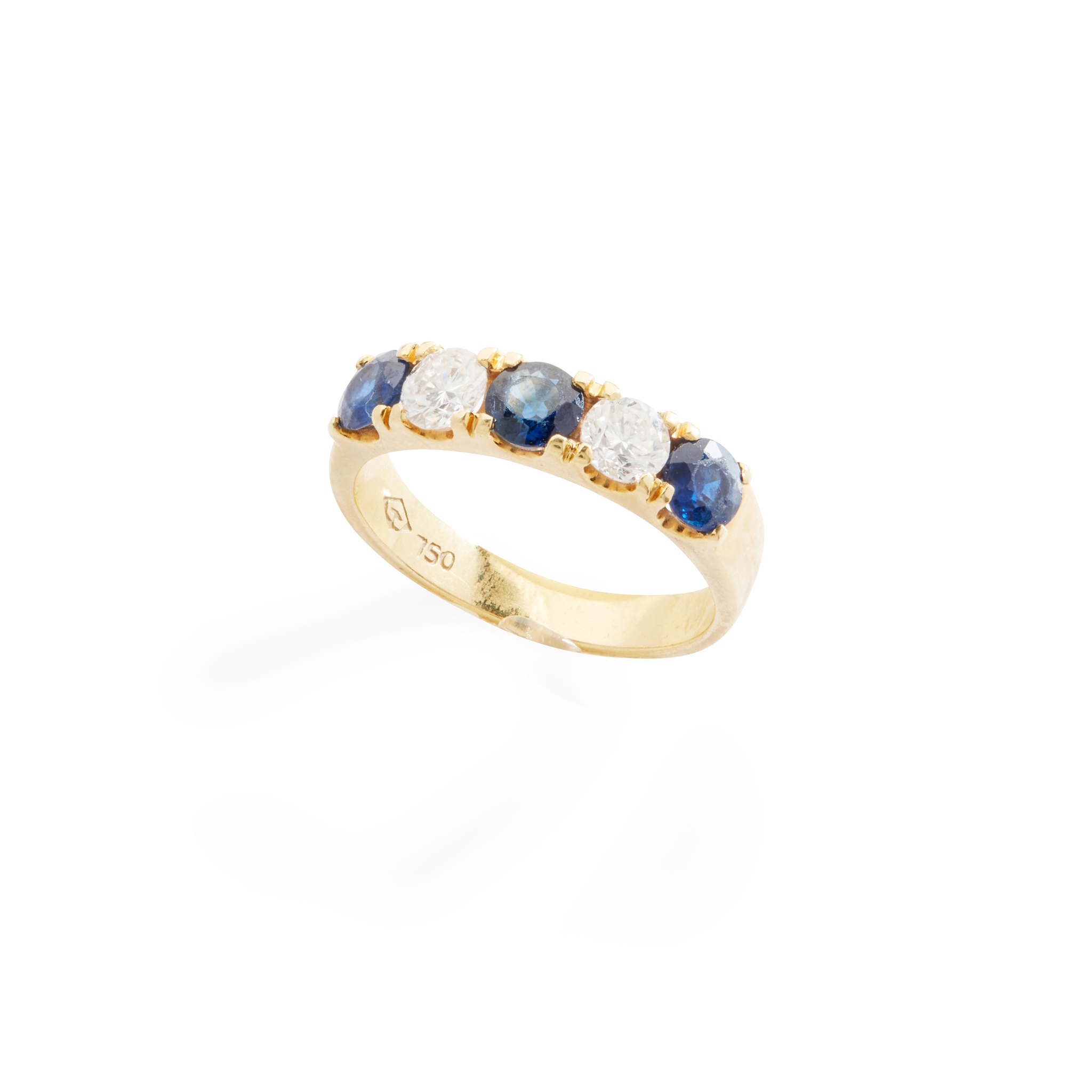 claw-set with two round brilliant-cut diamonds and three round-cut sapphires, stamped 750
