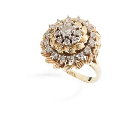 claw-set with graduated round brilliant and eight-cut diamonds between textured leaf details, stamped 14k