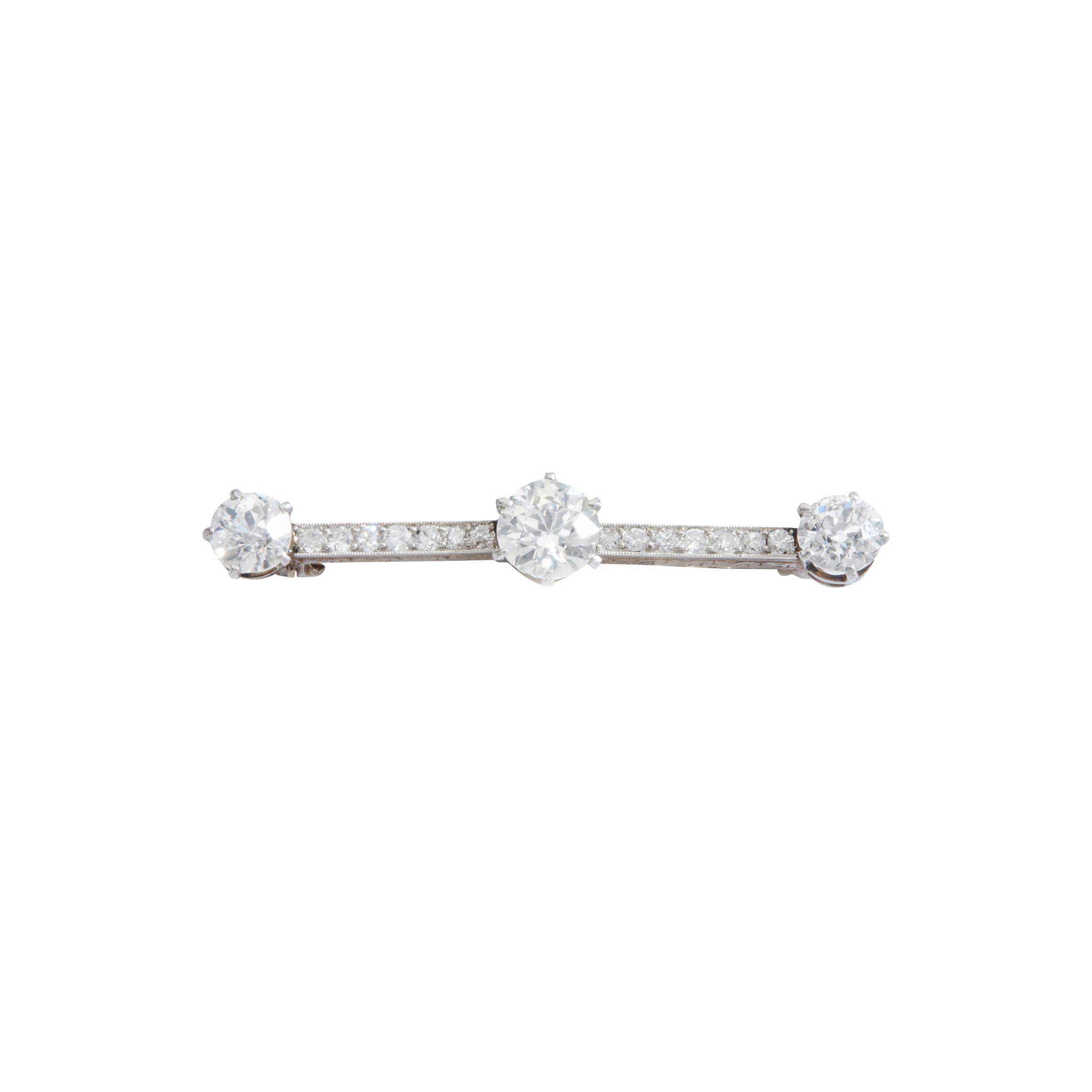 claw-set with three graduated old round-cut diamonds, the bar set with small round-cut diamonds, engraved detail to setting, unmarked