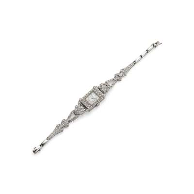 the rectangular dial with Arabic numerals, the case and strap set throughout with graduated eight-cut diamonds, concealed clasp, stamped PLATINUM