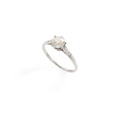 claw-set with an old round-cut diamond, each shoulder set with three French-cut diamonds, stamped PLAT