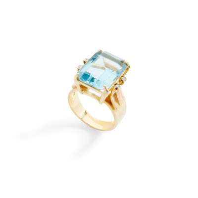 claw-set with a cut-cornered rectangular-cut blue topaz, each shoulder set with two small round brilliant-cut diamonds, stamped 18k