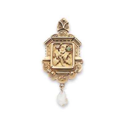 Of shaped rectangular outline with applied beaded and canatille detail, set with a small cushion-cut diamond and an oval-cut green tourmaline, suspending a baroque pearl drop, the reverse with a glazed compartment under a hinged cover, unmarked