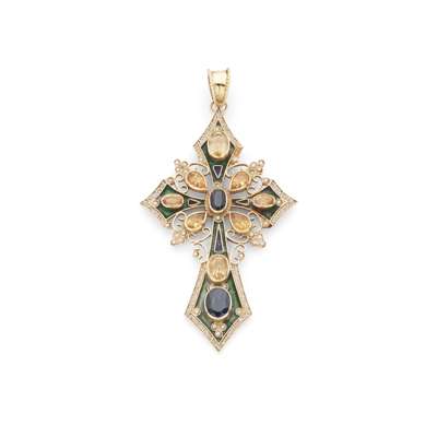 The enamel ground collet-set at intervals with oval and pear-shaped yellow and blue sapphires, seed pearl detail throughout, modelled in 18ct gold, signed PERCOSSI PAPI,