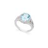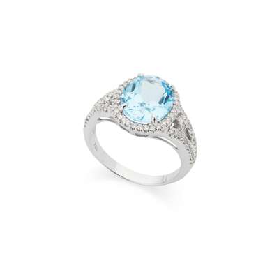 Claw-set with an oval-cut blue topaz, weighing approximately 4.27cts, the border and shoulders set with small round brilliant-cut diamonds, stamped 750