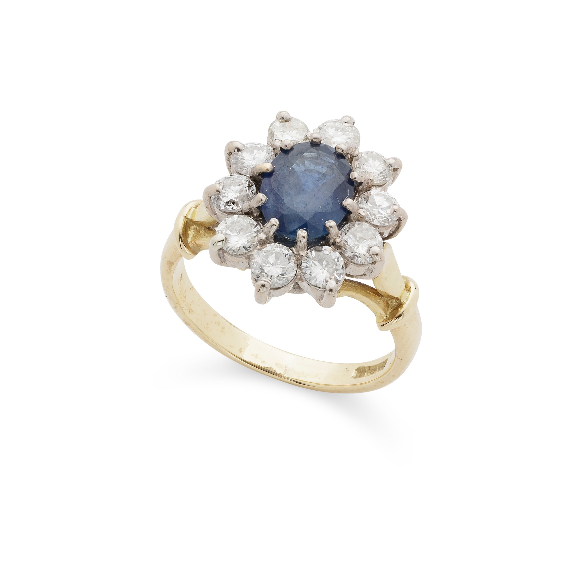 Claw-set with an oval-cut sapphire in a border of ten round brilliant-cut diamonds, modelled in 18ct gold