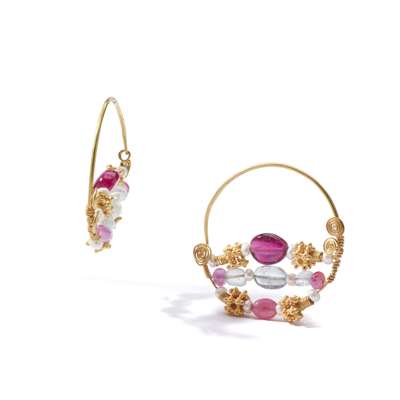 Each set with three rows of pink tourmaline, pale blue sapphire beads and seed pearls, modelled in 18ct gold