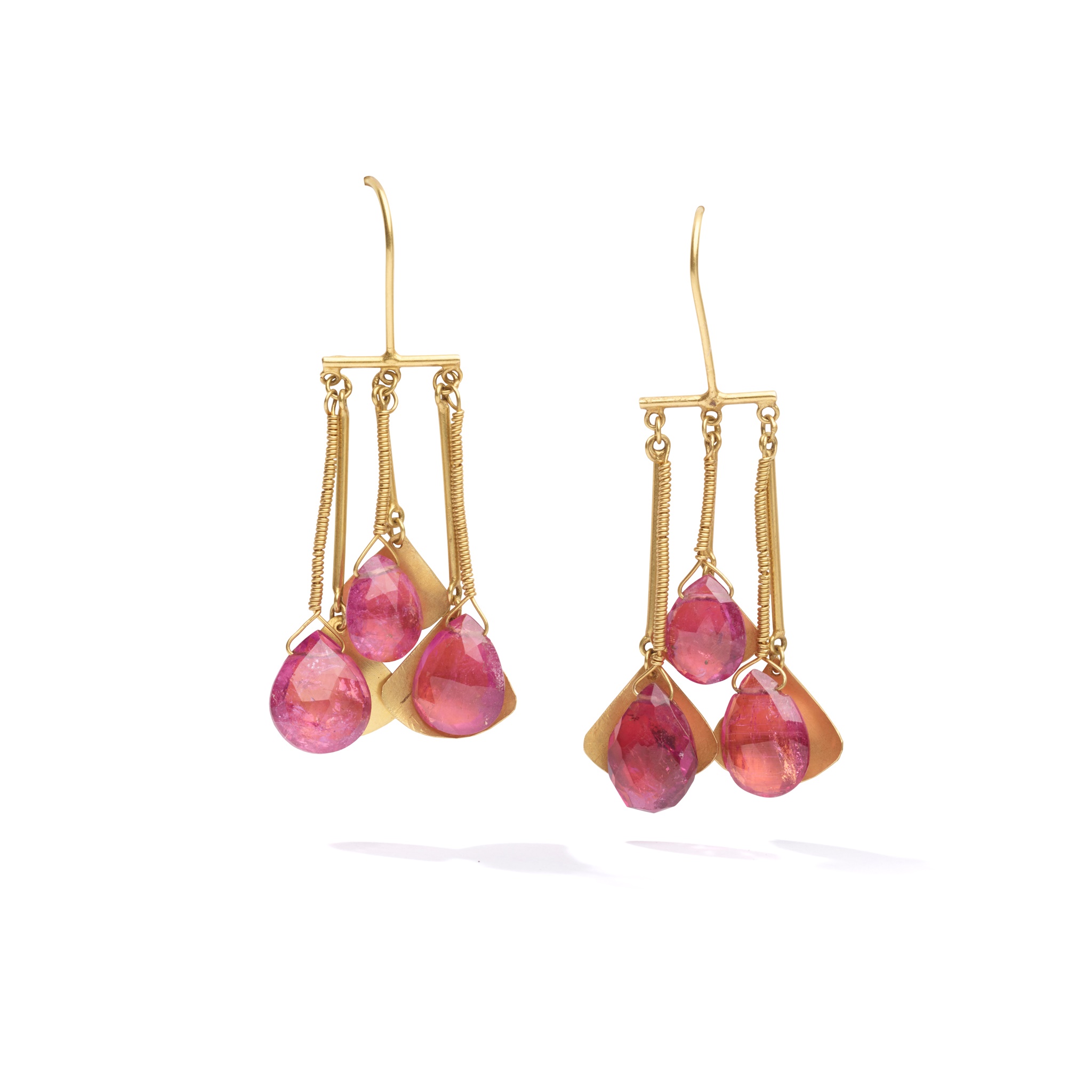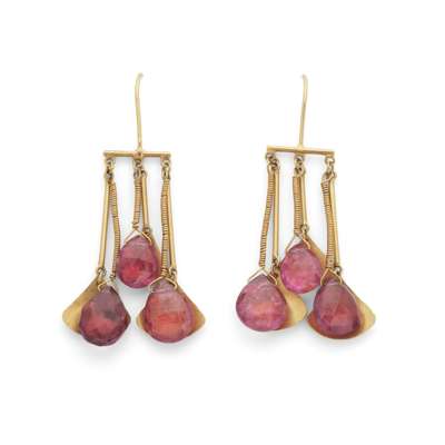 Each bar suspending a tassel of pendants and faceted pear-shaped pink tourmaline drops, hook fittings, modelled in 18ct gold