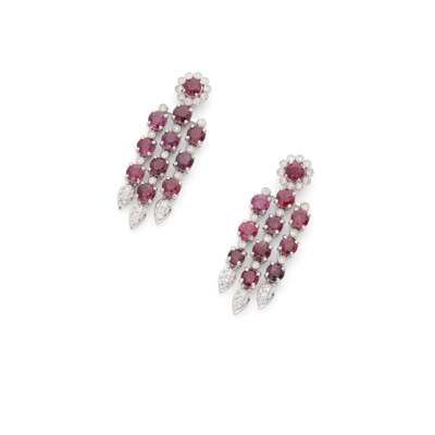 A pair of ruby and diamond pendent earrings