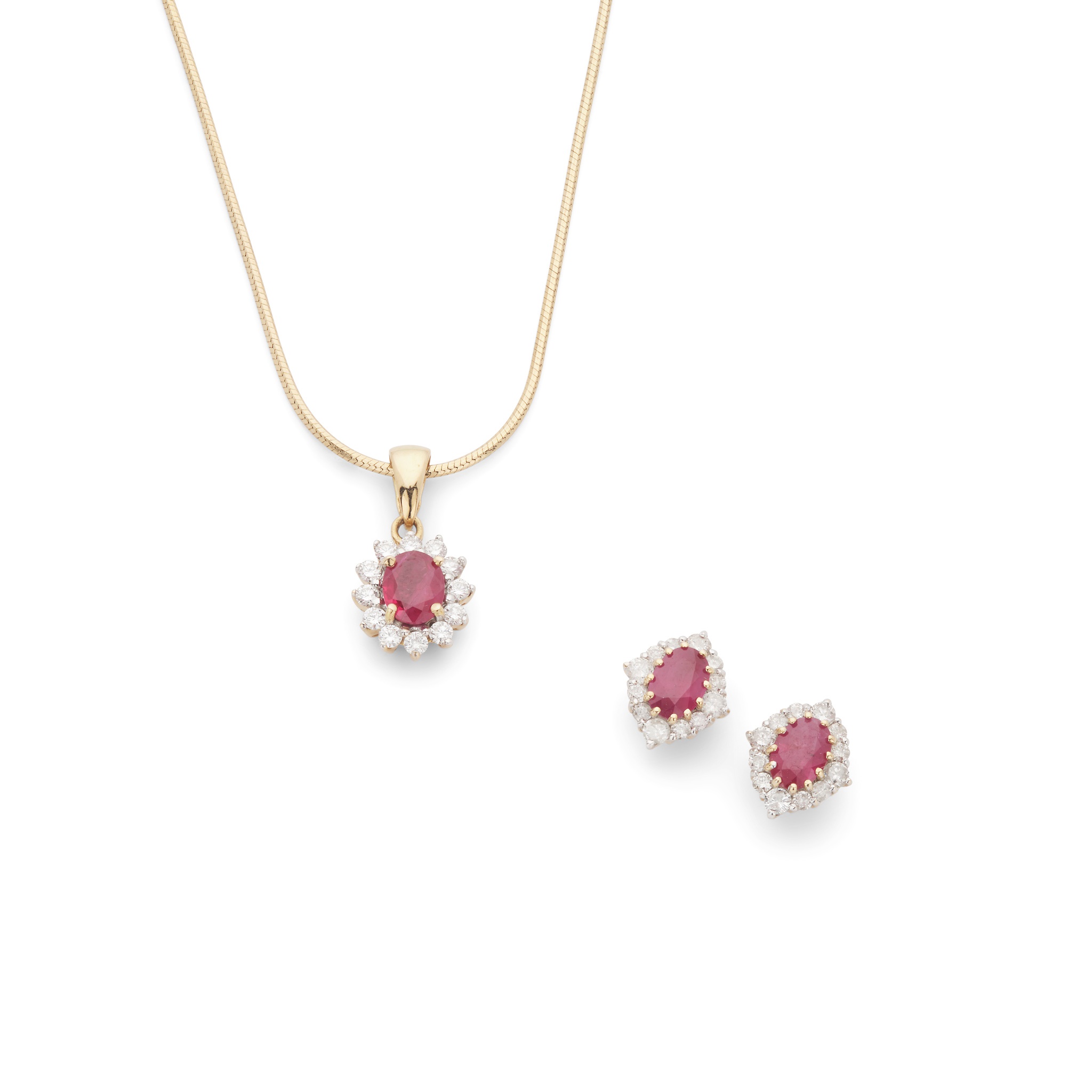 The pendant claw-set with an oval-cut ruby in a border of small round brilliant-cut diamonds, to a snake-link chain; together with a pair of matching earrings, post and screw-butterfly fittings, all modelled in 18ct gold