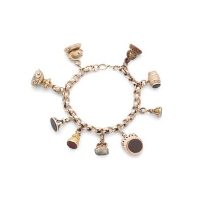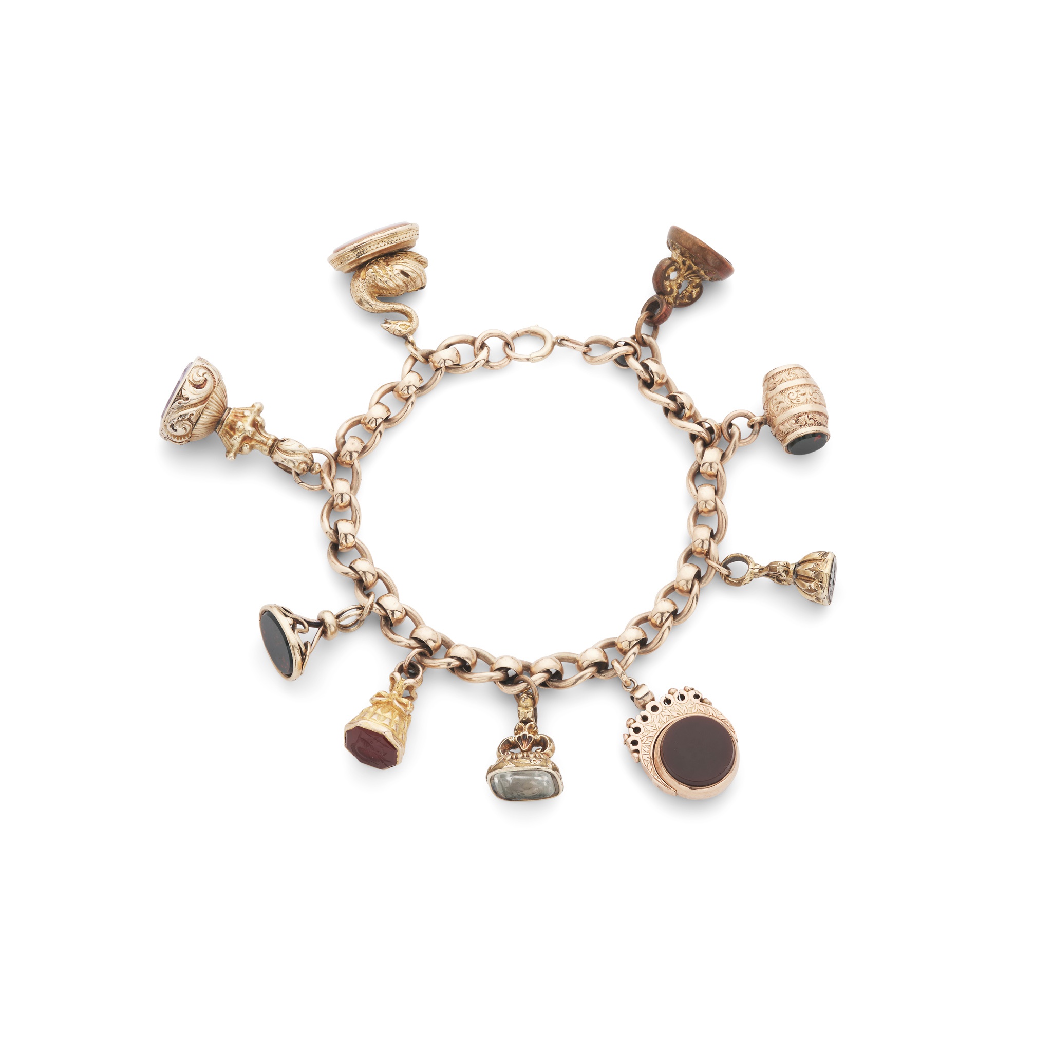 The 9ct gold fancy curb-link bracelet suspending various hardstone seals