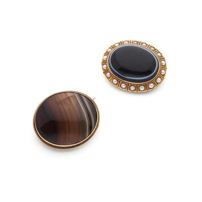 The first collet-set with a banded agate in a border of split-pearls, glazed panel to rear, unmarked; the second collet-set with a banded agate, unmarked