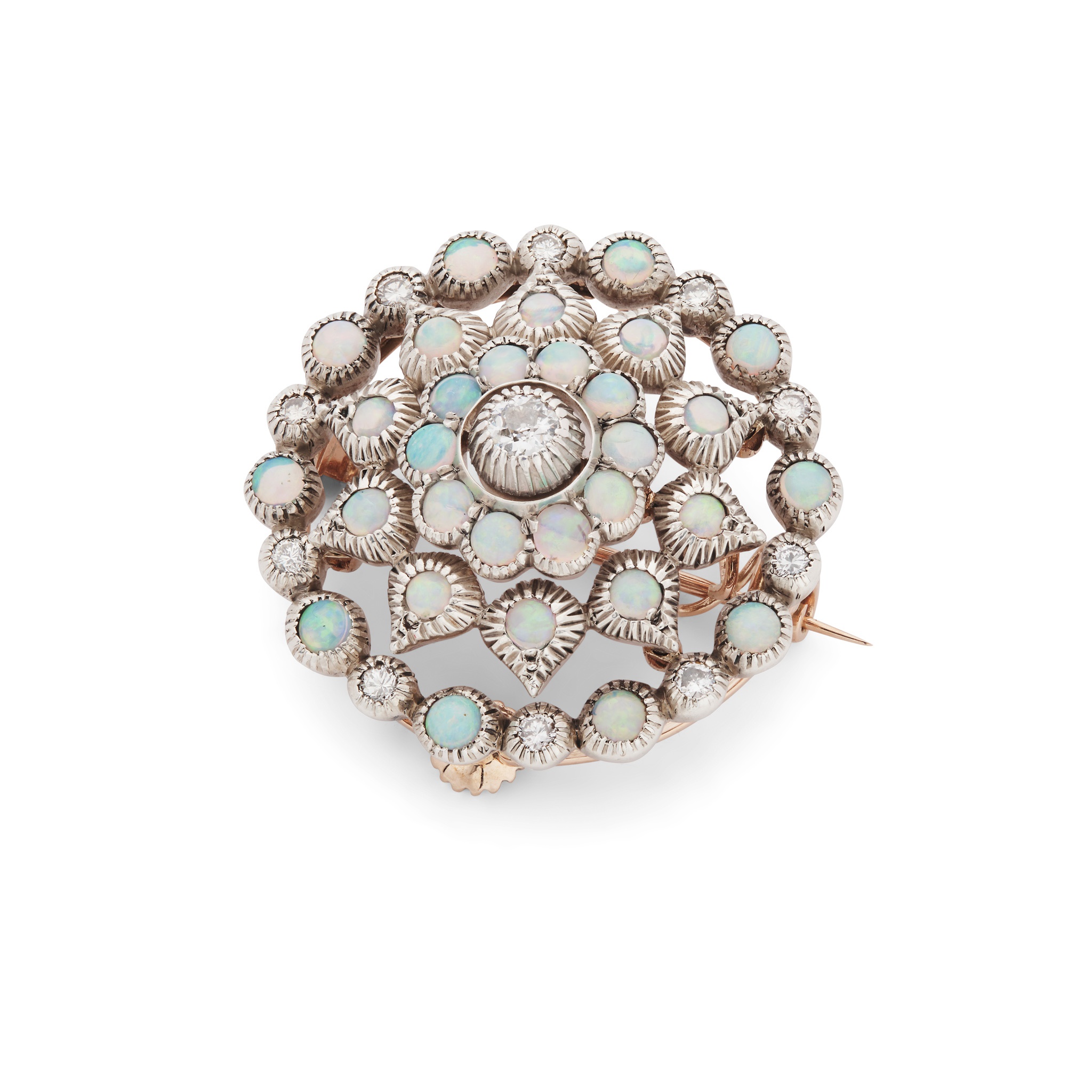 Set with a central old round-cut diamond in a border of cabochon opals and round brilliant-cut diamonds, unmarked