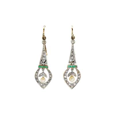 Each of pierced tapering design, set with rose-cut diamonds, square step-cut emeralds and a seed pearl, hook and clip fittings, unmarked