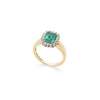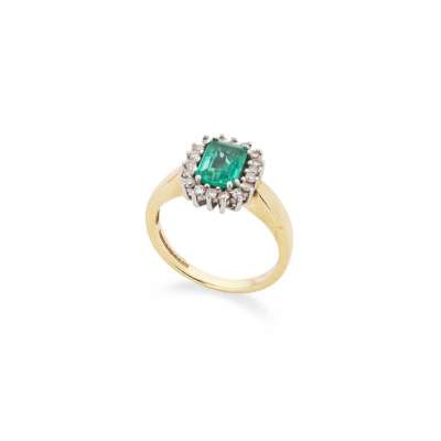Claw-set with a cut-cornered rectangular step-cut emerald, weighing approximately 0.70cts, in a border of small eight-cut diamonds, modelled in 18ct gold