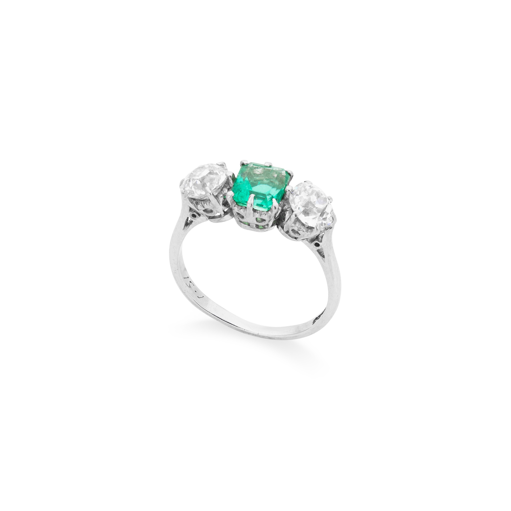 Claw-set with a cut-cornered square-cut emerald, weighing approximately 0.95cts, and two old round-cut diamonds, stamped PLAT