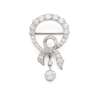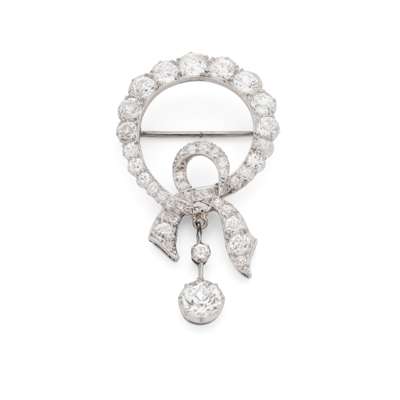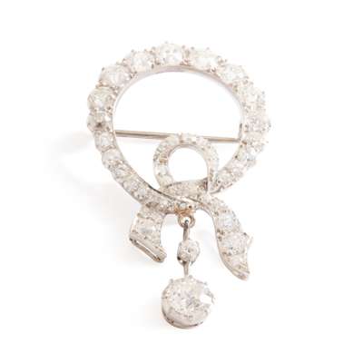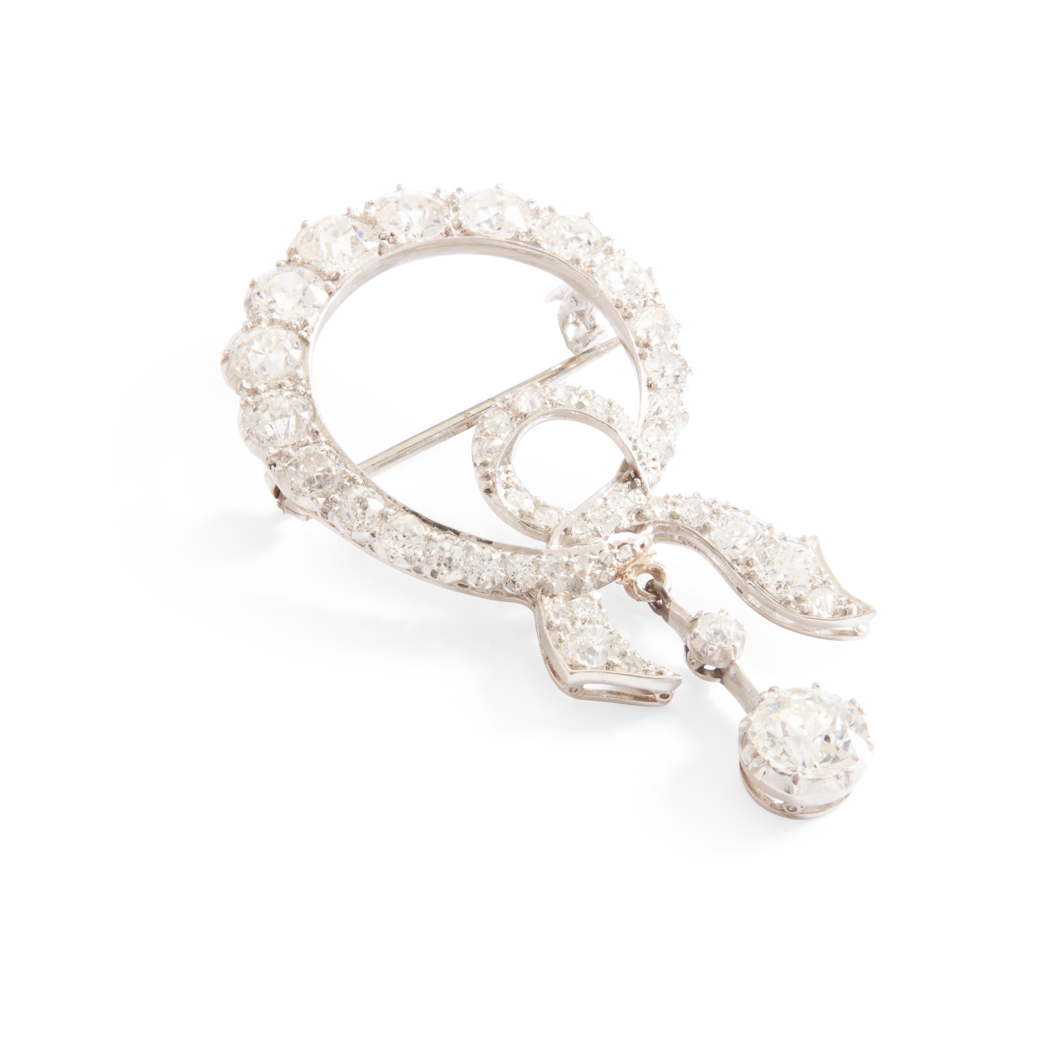 Of circular ribbon-tied design, set throughout with graduated old round-cut diamonds, suspending a knife-bar drop set with two graduated old round-cut diamonds, unmarked