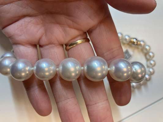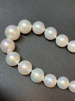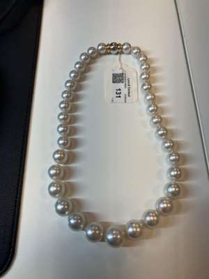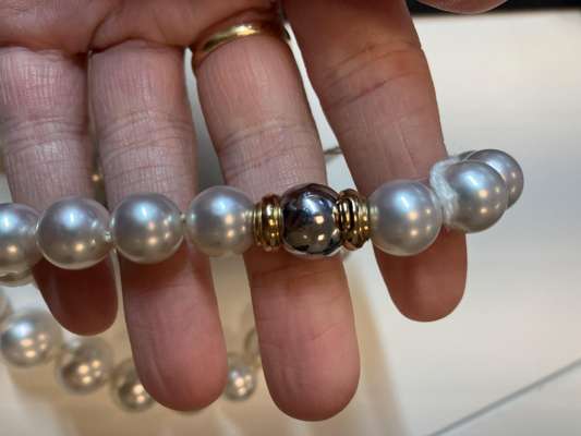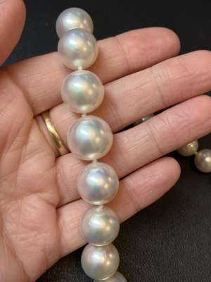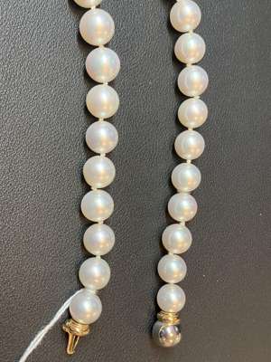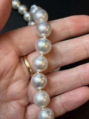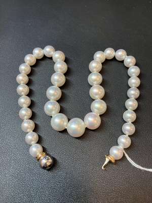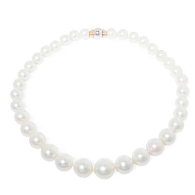 Composed of a single strand of graduated cultured South Sea pearls, the ball clasp stamped 750