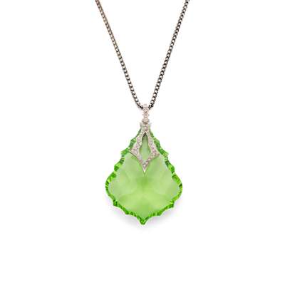 The shaped fancy-cut green crystal with applied stylised mount, set with round-cut cubic zirconia, to a fancy-link chain, modelled in silver